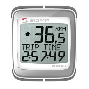The Sigma computer for dedicated cyclists. The "L" in the BC1606L is for the "smart" back light. The cadence functions (current and average) provide valuable training data for efficient cycling both on the road and in the woods, and can be turned off completely when not in use. The count down timer is perfect for crits, cross, or racing against the clock. Handlebar or stem mount. 16 Functions: speed, avg speed, max speed, speed comparison, trip distance, total distance bike 1, total distance bike 2, total distance bike 1 + 2, clock, ride time, low battery indicator, two bike programmable, total ride time bike 1, total ride time bike 2, total ride time bike 1+ 2, memory back up function, cadence, average cadence.